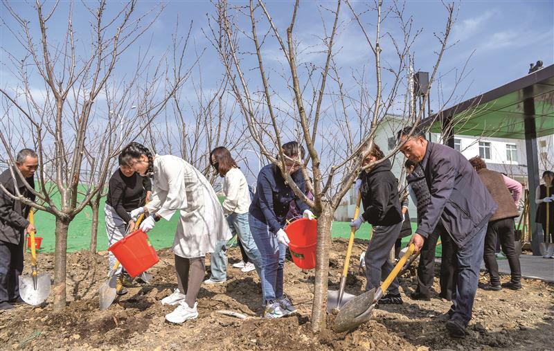 為營造更加綠色的居住環境,昨日,揚名社區組織轄區居民與共建單位君來洲際酒店的志愿者一起,在安置房小區建樂家園圍墻外的一片狹長荒廢地上植樹。(呂楓 攝)