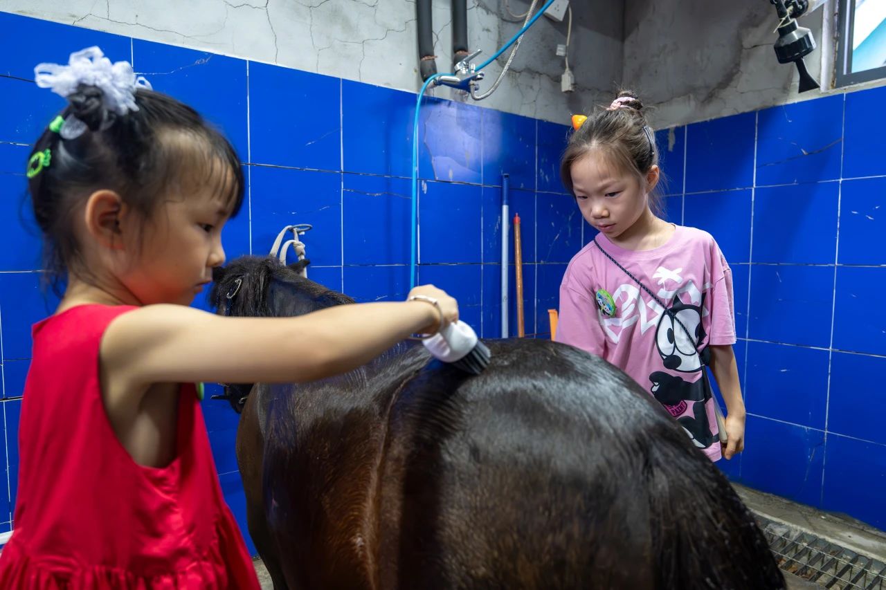 在保育員指導下為矮馬沖涼、刷背,