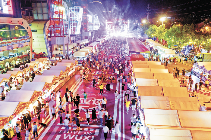 為有效把“蘇超”帶來(lái)的流量轉(zhuǎn)化為持久的經(jīng)濟(jì)動(dòng)能,無(wú)錫配合賽事,利用多個(gè)商場(chǎng)、景區(qū)、戶外廣場(chǎng)大屏進(jìn)行直播,打造遍布全城的“第二現(xiàn)場(chǎng)”,與城市空間、消費(fèi)場(chǎng)景深度融合。大東方百貨不僅設(shè)置了兩處大屏直播點(diǎn),更推出“跟著蘇超游無(wú)錫”主題活動(dòng);無(wú)錫招商城打造“夏日星空夜市”,有“蘇超”的周末客流量達(dá)上萬(wàn)人次;宜興“網(wǎng)紅夜市”蛟橋河步行街里,足球激情與地?cái)偨?jīng)濟(jì)碰撞出新火花……7—8月,中山路、長(zhǎng)江路、太湖新城等多個(gè)市商務(wù)局重點(diǎn)監(jiān)測(cè)商圈銷(xiāo)售額實(shí)現(xiàn)同比兩位數(shù)增長(zhǎng),其中中山路商圈單月增幅超20%。