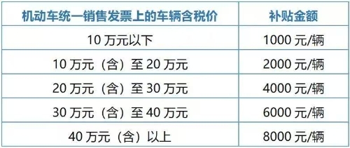 審核通過后,按機動車銷售統(tǒng)一發(fā)票上的購車價格(含稅價),分別給予一次性補貼。 ![]()