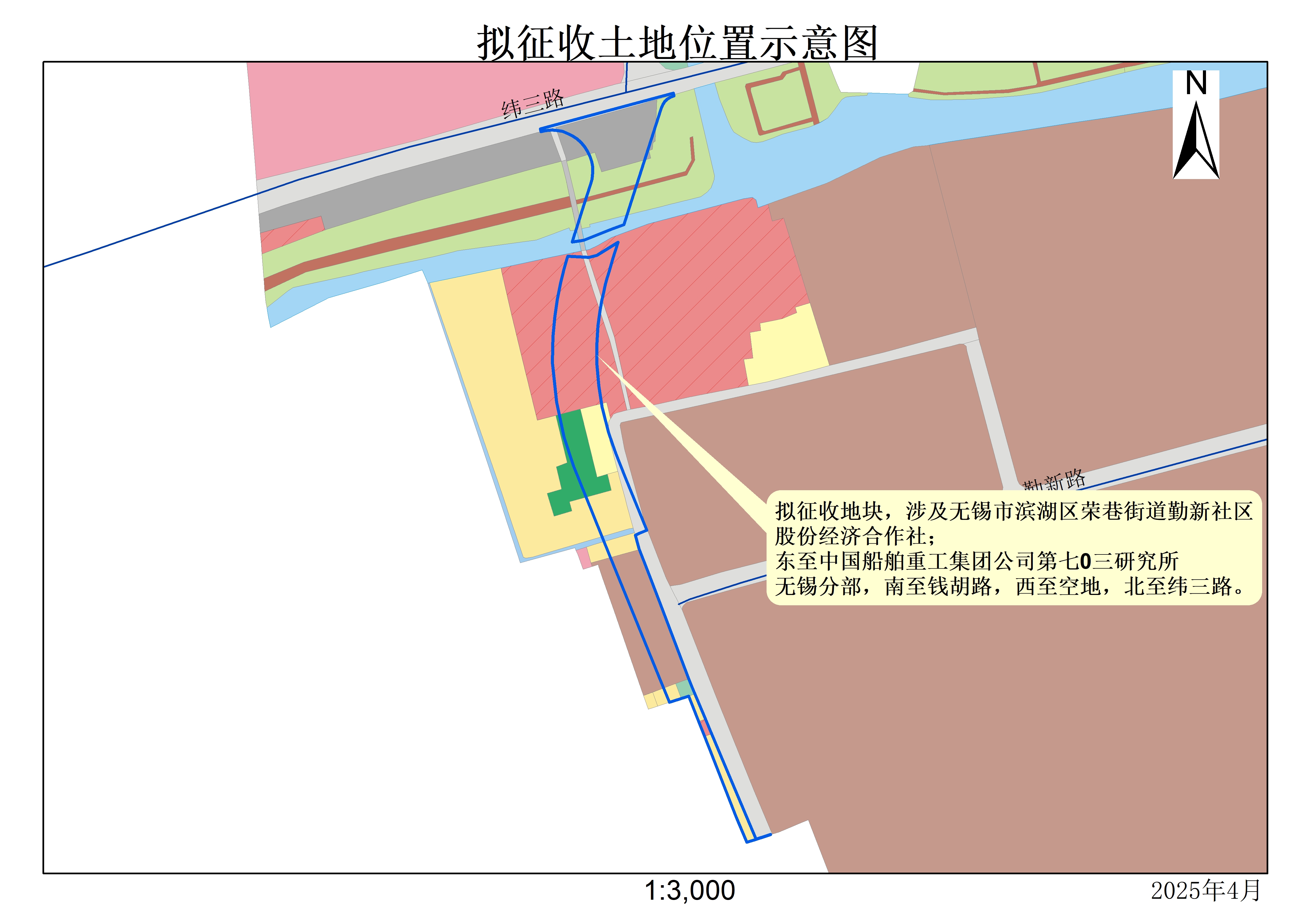 本次擬征收土地位于無錫市濱湖區(qū)榮巷街道勤新社區(qū)股份經(jīng)濟(jì)合作社范圍內(nèi)。地塊名稱為舜新路延長段(錢胡路~緯三路)新建項(xiàng)目,擬征收土地位置詳見附圖。