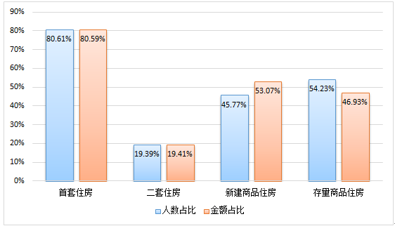 從貸款群體來看,剛需與改善型住房需求職工分別占貸款總?cè)藬?shù)的19.39%和71.88%。從單位性質(zhì)來看,以城鎮(zhèn)私營企業(yè)及其他城鎮(zhèn)企業(yè)職工為主,貸款筆數(shù)和貸款金額占比分別為57.69%、55.66%。從購房面積來看,職工貸款購買90(不含)-120㎡房屋居多,占貸款總?cè)藬?shù)的43.89%。從主借人繳存基數(shù)來看,貸款主要以中、低收入職工為主,分別占貸款總?cè)藬?shù)的27.48%、71.69%。從貸款類型來看,純公積金貸款和組合貸款占比分別為86.35%、13.65%。從貸款結(jié)構(gòu)來看,首套住房公積金貸款職工占貸款總?cè)藬?shù)的80.61%,二套住房公積金貸款人數(shù)占19.39%。具體放貸結(jié)構(gòu)如下: