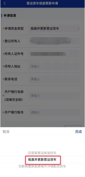 2.請根據自身情況選擇“僅報廢老舊營運貨車、報廢并更新營運貨車、僅新購新能源城市冷鏈配送貨車”三種類型之一進行申報,提交后不得更改。 3.非營運車輛和輕型貨車(除新能源城市冷鏈配送貨車外)不在本次補貼之列。
