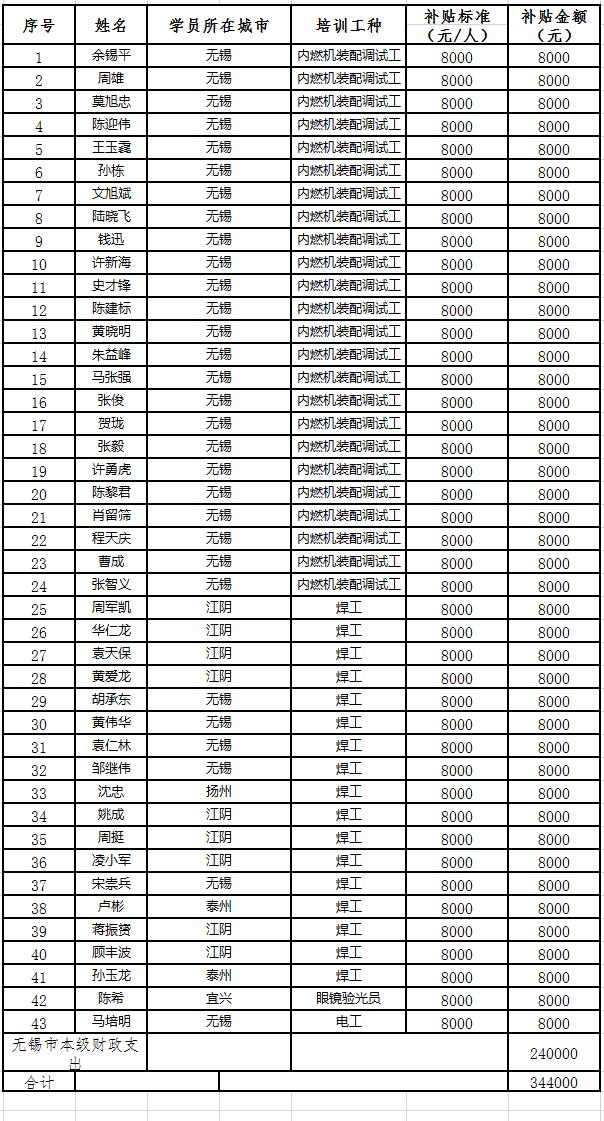 根據《省人力資源社會保障廳 省財政廳關于組織2025年度高級技師崗位技能提升培訓的通知》(蘇人社函〔2025〕83號)精神,經審核,共有43人符合高級技師崗位技能提升培訓補貼條件,其中無錫市本級30人,江陰9人,宜興1人,泰州2人,揚州1人(無錫市本級財政補貼僅限于無錫市本級的30名學員)。現將名單公示如下:
