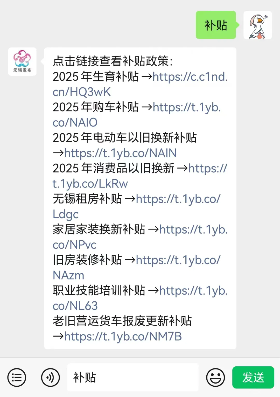 2. 在“無錫發布”微信公眾號對話框