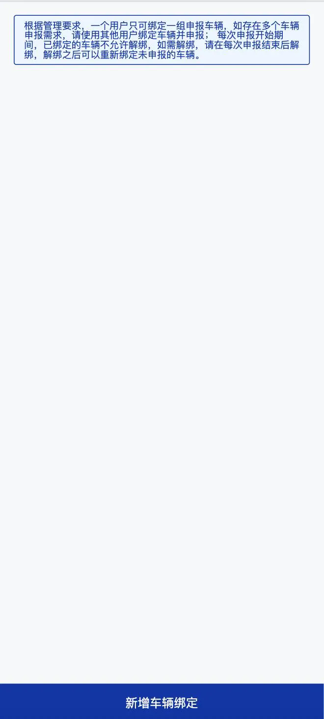 特別提醒:綁定之后,需要選擇申報類型并綁定車輛,一個綁定用戶只可綁定一次申報車輛,如存在多個車輛申報需求,請使用其他用戶綁定車輛并申報。每次申報開始期間,已綁定的車輛不允許解綁,如需解綁,請在每次申報結束后解綁,解綁 之后可以重新綁定未申報車輛。(注:申報期間也不能更改申報類型和更換綁定車輛)。