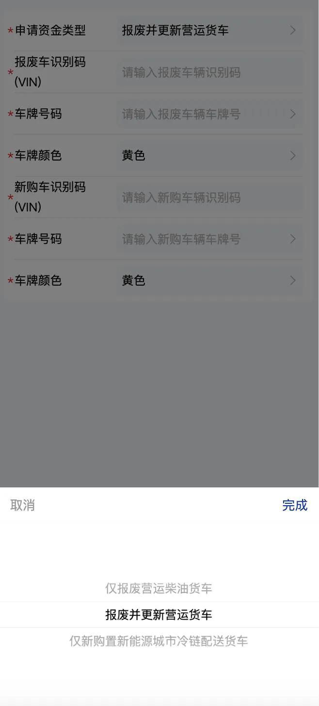 3.請根據自身情況選擇“僅報廢老舊營運貨車、報廢并更新營運貨車、僅新購新能源城市冷鏈配送貨車”三種類型之一進行申報,提交后不得更改。