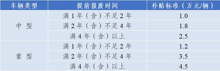 今年老舊營運貨車報廢更新的補貼標準與去年基本保持一致,按照報廢車輛類型、提前報廢時間和新購置車輛動力類型等,實施差別化補貼,具體如下: