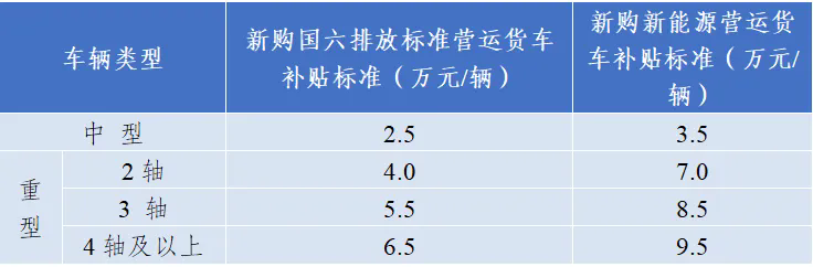 3.對距離強制報廢年限不滿一年的國四及以下排放標準營運貨車實施報廢,并新購中重型國六排放標準貨車或新能源貨車的,按照新購補貼標準予以補貼;對掛車不予補貼。