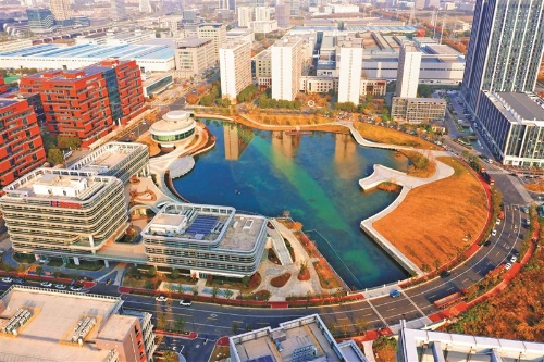 在現(xiàn)場,記者看到了一幅產(chǎn)業(yè)與生態(tài)相融共生的美好畫卷:產(chǎn)業(yè)載體的玻璃幕墻與鋼鐵交織的冷硬質(zhì)感,被溫潤的湖水悄然“融化”;小三五成群在湖面上悠然“踱步”,戴勝鳥在岸邊發(fā)出“咕咕—咕咕—咕咕”的鳴唱;景觀廊道上還能看到孩子們歡快玩耍的身影……